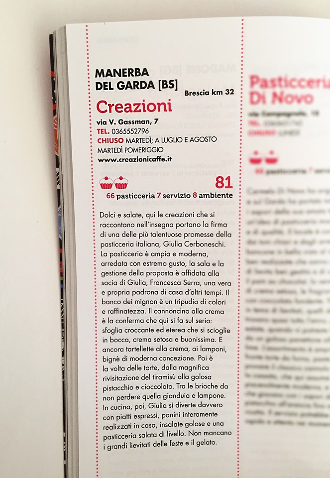 «Dolci e salate, qui le creazioni che si raccontano nell’insegna portano la firma di una delle più talentuose promesse della pasticceria italiana, Giulia Cerboneschi […] la sala e la gestione della proposta è affidata alla socia di Giulia, Francesca Serra, una vera e propria padrona di casa d’altri tempi».